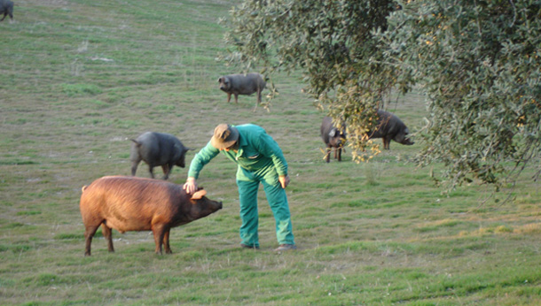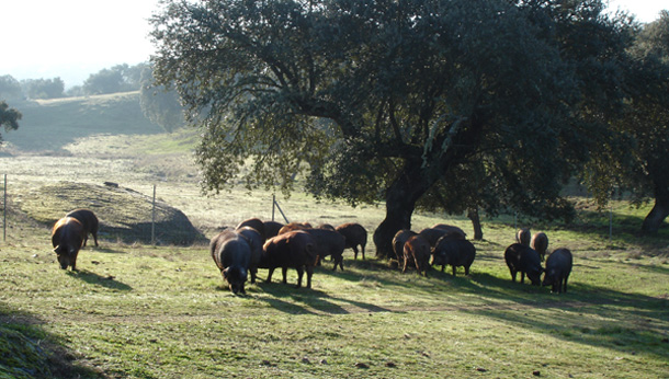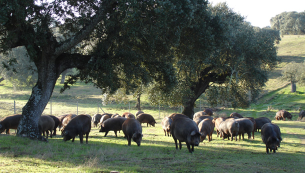 La Dehesa es el hábitat natural del cerdo ibérico de bellota; en ella nace, vive y engorda hasta su posterior sacrificio, siendo especialmente cruciales sus últimos meses de vida en los cuales se alimenta sola y exclusivamente de bellotas, ya sean de encinas o de alcornoque, hierbas, raicillas y todo tipo de tubérculos que puedan encontrar en el campo.